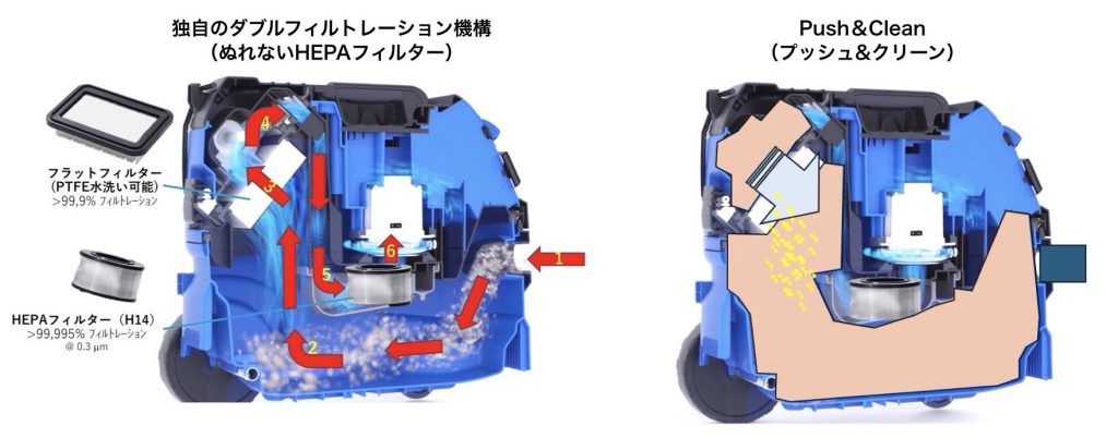 独自の空気経路と多段式フィルタリング構造により、水がNGのHEPAフィルターを濡らすことなく安全に使用できます。